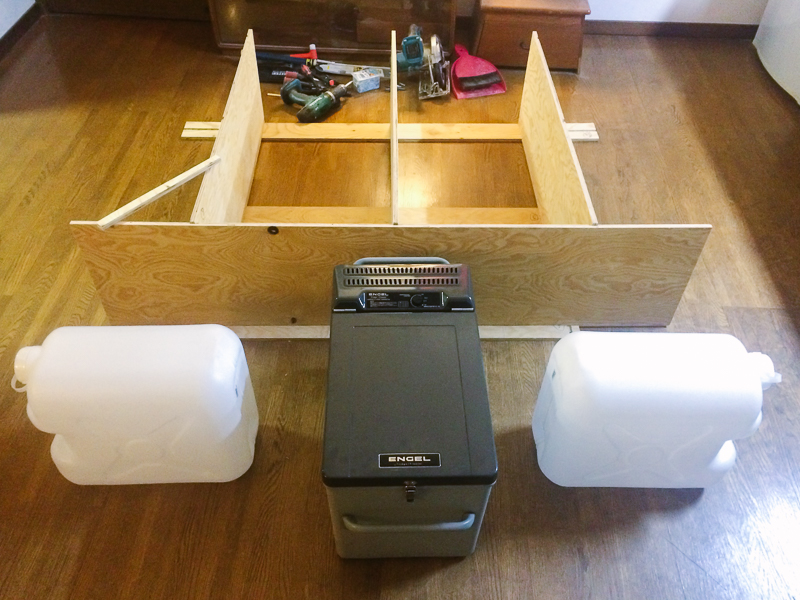 Whilst I had a pretty clear picture in my mind of how the drawers were going to fit together, I was not at all clear how the forward half of the platform was going to work out. Whatever I was going to end up with had to be able to accommodate our fridge, store two 20L water containers, support the combined weight of Clare and I (not at all trivial!), provide storage space for other random crap and hopefully not fall apart after a couple of months.