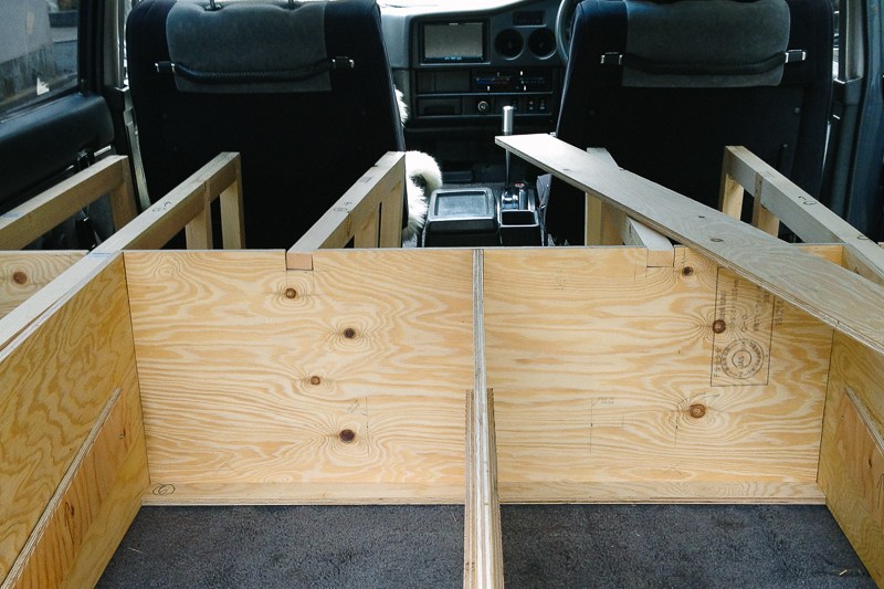 After cutting some panels to box out the fridge area the time for the sleeping platform itself finally came! After a visit to a different DIY shop the weekend before we’d been able to get some 15mm thick timber – it’s not ply exactly, but will be good enough; so it was from this I cut the platform. There’s not much to report about this job other than my back really, really hurt at the end of leaning over whilst cutting all the slots! I hope I have them in the right place….